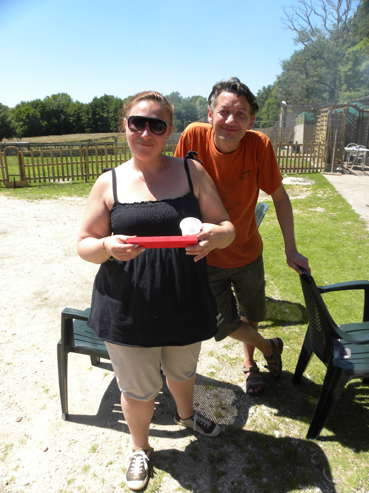 Au programme de la journée, Airsoft pour commencer (où Travoltong semblait avoir des comptes à régler avec le coach !) au milieu des moustiques. David le fermier est dans le marais rejoignant ses coéquipiers pour quelques échanges et piquent… Le temps de se changer et l’apéro en l’honneur de la quarantaine de David pouvait commencer sous les effluves des premières grillades. Une fois les tournées de rosé pamplemousse et de vodka (ukrainienne) pomme terminée, la petite cérémonie des récompenses de fin de saison pouvait commencer. A nouveau Ludo fut à l’honneur avec trois titres dont celui de meilleur buteur, qui lui permis d’offrir à son auditoire un discours spontané et émouvant (Vincent G en pleure encore). Notre nouveau couple Romain-Wilfried ne fut pas oublié dans la catégorie meilleure recrue, tout comme Vincent pour la Cuvée RFC. Yannick, Ludo, Gilles, Laurent et Cyril, top 5 du Challenge des présences, ont été également habillés pour la prochaine saison avec shorts, chaussettes et bon d’achat. Enfin, fidèles parents souvent présents pour donner un coup de main dans la mise en place des différents et nombreux projets du club, Fabienne et Sylvain n’ont pas été oubliés.
