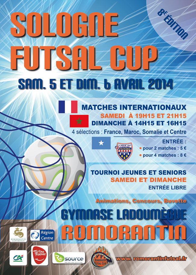 Pour la 8ème année consécutive, le Romorantin Futsal Club organise la Sologne Futsal Cup, tournoi national dont l’édition 2014 se tiendra le week-end du 5 et 6 avril 2014 au gymnase Ladoumègue de Romorantin.