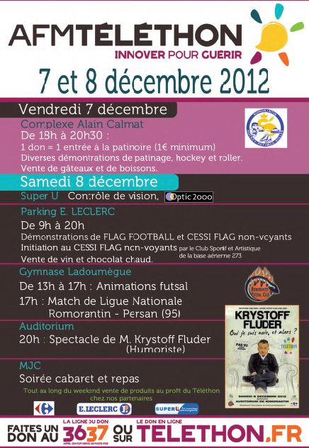 Grosse journée en perspective pour le RFC ce samedi 8 décembre 2012, qui marquera la première participation du club au Téléthon. Pour une première le RFC a mis les petits plats dans les grands, avec animations diverses autour du futsal au gymnase Ladoumègue à partir de 14h00, un match de gala de Ligue Nationale à 17h00, un apéritif dégustation de la cuvée RFC,un spectacle d’un humoriste parisien à l’auditorium, et enfin le repas de fin d’année du club !